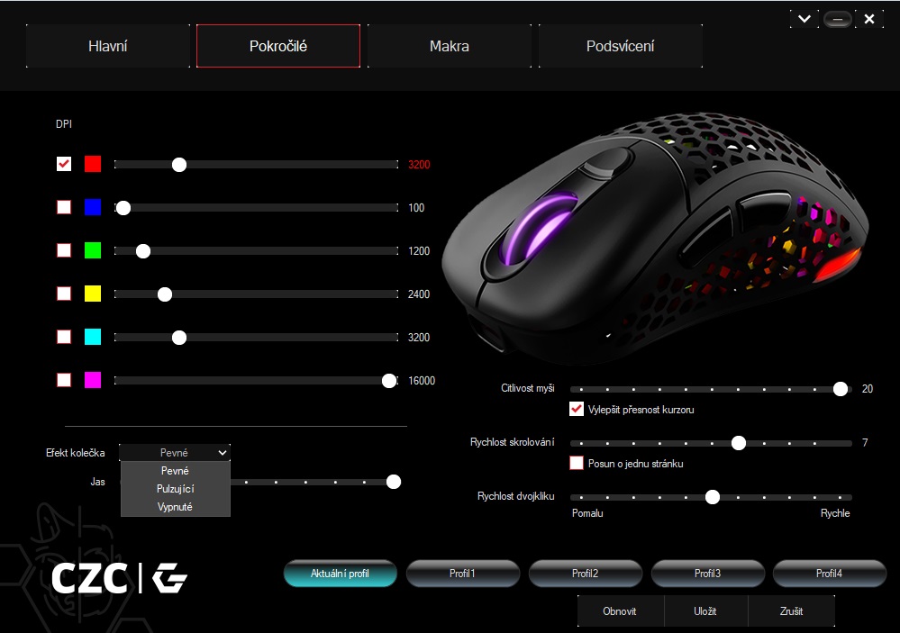 Barva podsvícení kolečka se váže na zvolené DPI neboli citlivost snímače. Takže jak je ten obrázek, tam si můžete měnit barvy pro různou citlivost, nefunguje to odděleně jako u podsvícení zad.